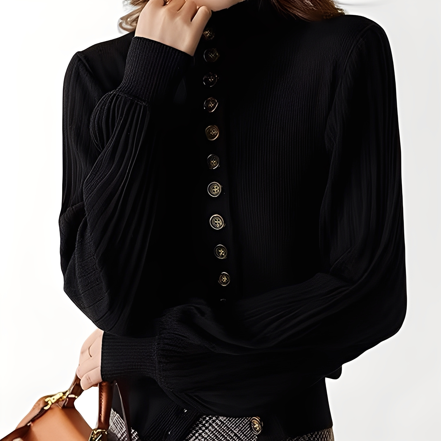 Pletený top Adelyn kombinuje nadcasovou eleganci s moderními detaily. Stojácek a dekorativní knoflíky dodávají topu rafinovaný nádech, zatímco lucernové rukávy zajištují ženský a lehký vzhled. Perfektní pro dodání nádechu elegance vašemu každodennímu outfitu nebo pro nošení pri zvláštních príležitostech.