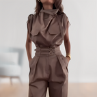 Dodejte svému stylu moderní nádech s tímto elegantním bezrukávovým overalem. Vysoký střih spolu s páskem zvýrazní vaši postavu a zároveň nabízí ležérní eleganci pro různé příležitosti.