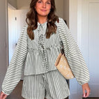 Objevte dokonalý letní vzhled s 'Lola Letní Set': dámská sada topu a šortek s volným střihem, vysokým pasem a boho pruhovaným designem! Tato sladěná sada, skládající se z volného topu s dlouhými balónovými rukávy a pruhovaných šortek s vysokým pasem, je perfektní pro horké dny a nenucený styl. Top má kulatý výstřih s detailem uzlu a řasený pas pro lichotivý střih.