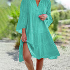Přijměte boho-chic styl s Mia, rovnými šaty z bavlněné směsi s geometrickým vzorem. Jeho volný a splývavý střih, výstřih do V a 3/4 rozšířené rukávy nabízejí pohodlí a eleganci pro každý den. Perfektní pro jaro, léto a podzim, lze nosit jak ve městě, tak na dovolené.Příznivá silueta: