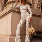 Zářivá elegance! Dámská Kombinéza - Krajka s Flitry - Dlouhé Rukávy - Kulatý Výstřih - Přiléhavý Model je ideální pro večer.