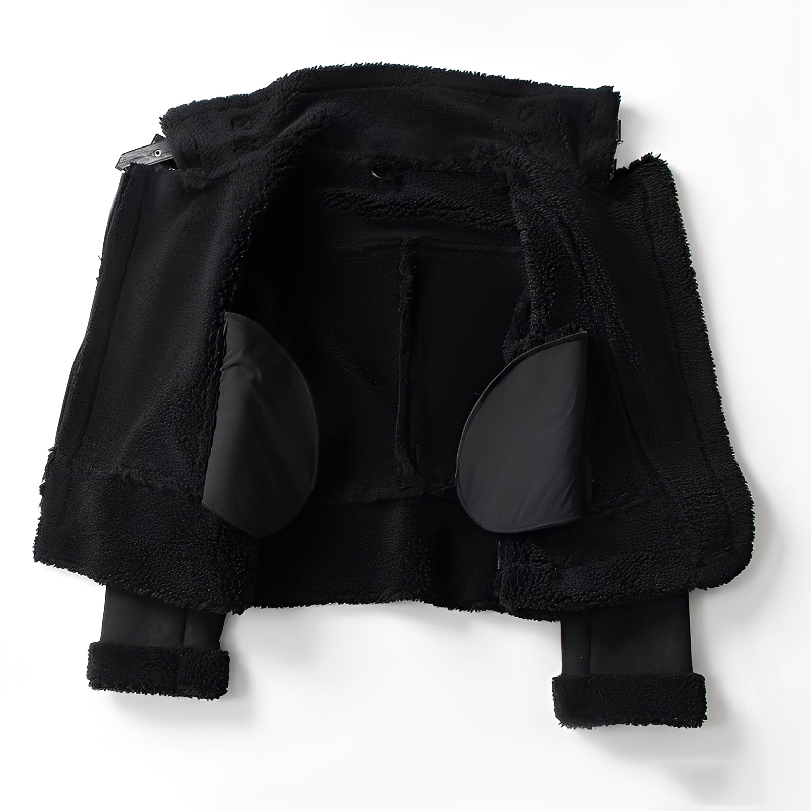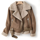 Bunda „Yasmine“ kombinuje cool vzhled bikeru s útulným teplem. Vyrobena z měkkého semiše zvenčí a podšitá hřejivou jehněčí kůží uvnitř, nabízí styl i pohodlí v chladném období. Výrazný reverzní límec a detaily v motorkářském stylu jí dodávají moderní nádech. Ideální pro ženy, které hledají teplého, robustního a přesto módního společníka.